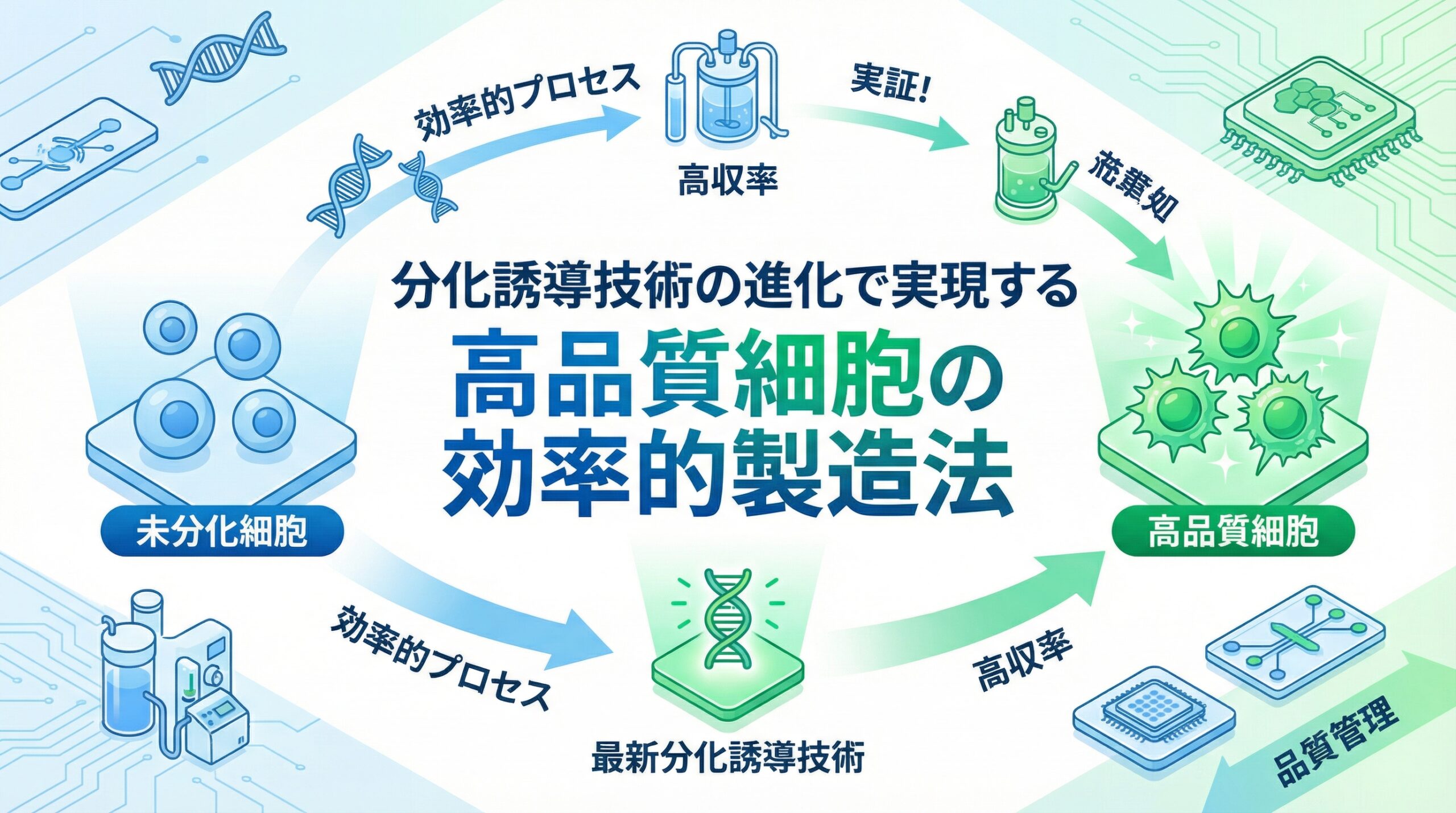 分化誘導技術の進化は、再生医療を「実験室の科学」から「産業としての医療」へと昇華させるための原動力です。確率的な制御から決定論的な精密制御への移行、低分子化合物や物理的刺激の活用、そしてAIや自動化技術との融合により、高品質な細胞を低コストで安定供給する未来が現実のものとなりつつあります。